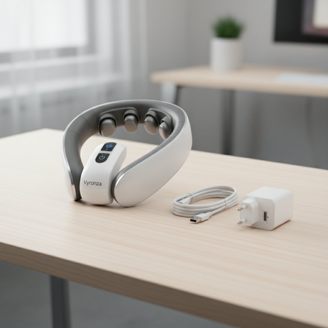 1 x Vyronza Aura Neck Massager, 1 x USB-C Charging Cable, 1 x User Manual.